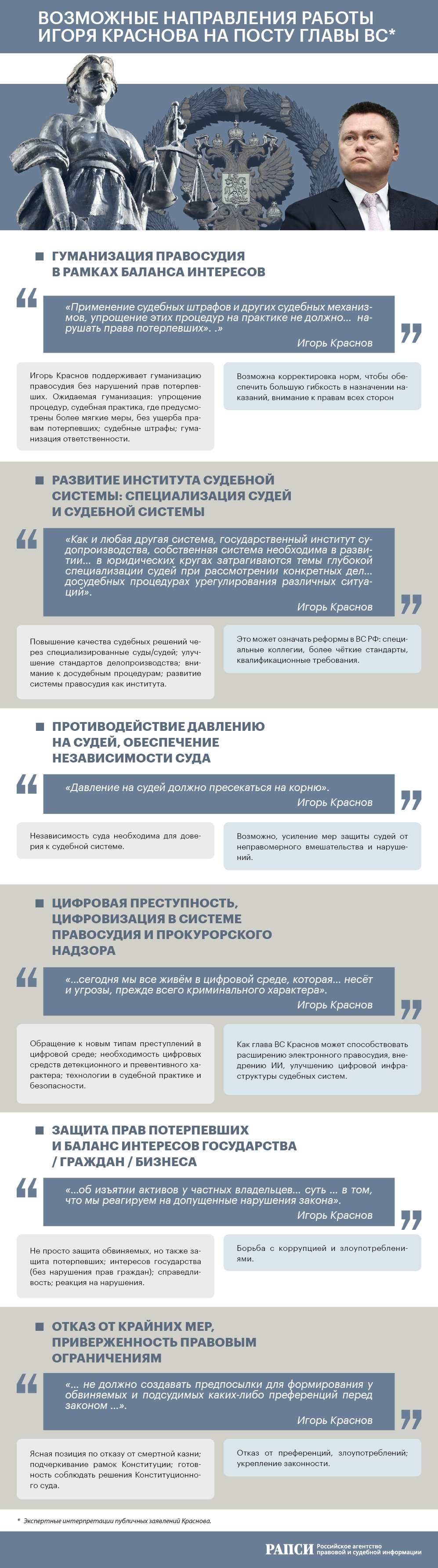 Назначение Игоря Краснова на пост Председателя Верховного Суда РФ происходит в момент, когда российская судебная система одновременно сталкивается с вызовами цифровой трансформации, необходимостью сбалансированной гуманизации наказаний и усиления гарантий независимости судей. На основании публичных выступлений и интервью Краснова эксперты выделили возможные направления его работы на посту главы ВС РФ.