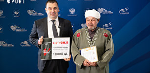 Руководитель исполкома Народного фронта Михаил Кузнецов вручил лауреату III Всероссийской премии «Служение» имаму Ренату Гарифуллину сертификат на один миллион рублей в рамках спецприза президентского движения в номинации «С передовой СВО — в муниципалитет».